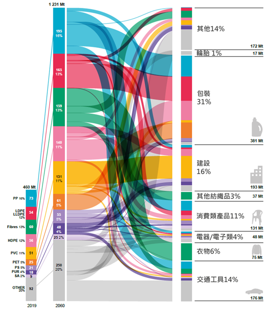 圖1 OECD—2019年至2060年全球塑膠使用量增長情形-材質對應應用
