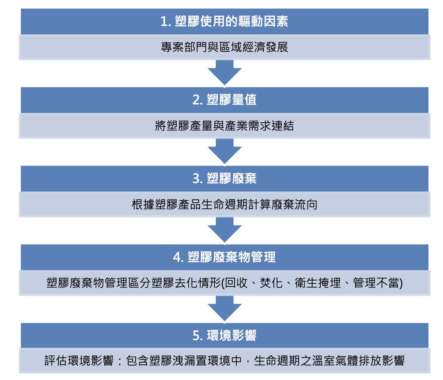 《全球塑膠展望》報告以ENV-Linkages 模型方法框架,針對塑膠污染現狀、未來預測、政策情境及實施路線圖的全面性分析,在數據面的資料來源,整合亞太經濟合作組織15個以上國家在塑膠生命週期各階段的國家級數據、世界銀行全球數據庫、相關國家的公開資料、研究機構與學術資料及OECD全球塑膠展望數據庫,該數據庫透過收集並核對全球塑膠整個生命週期的資料,從生產、使用、廢棄物產生和廢棄物管理,包括管理不善或洩漏到環境中的廢棄物等,如圖1所示,其中大部分資料透過ENV-Linkages模型基於所收整的相關變數來模擬推估,推估方法又分為五大步驟,如圖2所示,其中=經濟流量、塑膠、塑膠廢棄物的預測,主要倚賴OECD ENV-Linkages模型(步驟1~4),而其他環境影響則依賴外部模型(步驟5)。