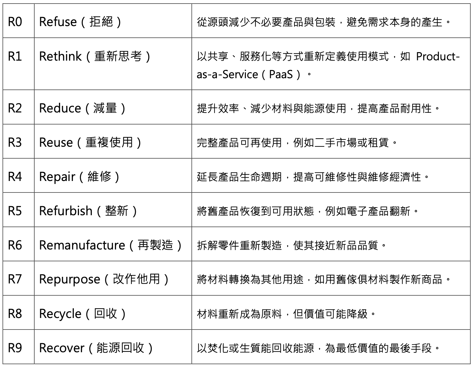 早期環保倡議以「3 R」為主:減量(Reduce)、重複使用(Reuse)、回收(Recycle)。然而,歐盟與德國在多年政策推動中發現,這三項原則過於籠統,很難指導企業確實落實循環策略。因此,德國提出更精細且具行動性的 「10 R」框架,成為歐洲循環經濟政策的重要基礎,也被多國企業視為循環轉型的重要指標。